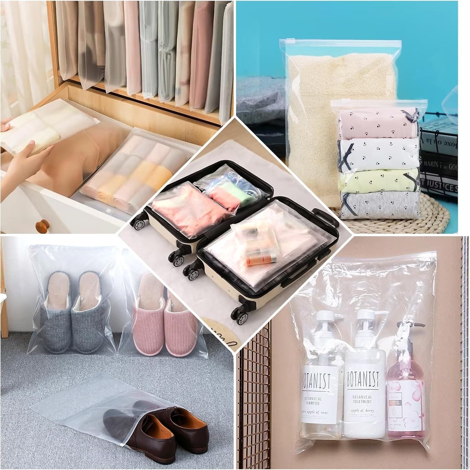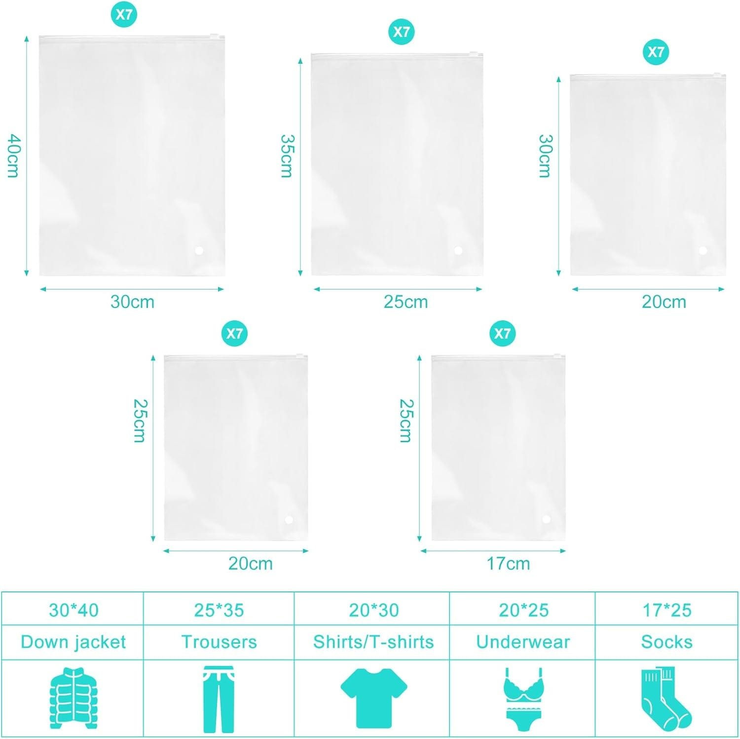 Molto utili sia per suddividere e conservare la roba in valigia, che negli armadi. Fatti bene, con buchino x non far gonfiare il sacchetto alla chiusura. Trasparente per vedere il contenuto. Resistenti. Capienti.