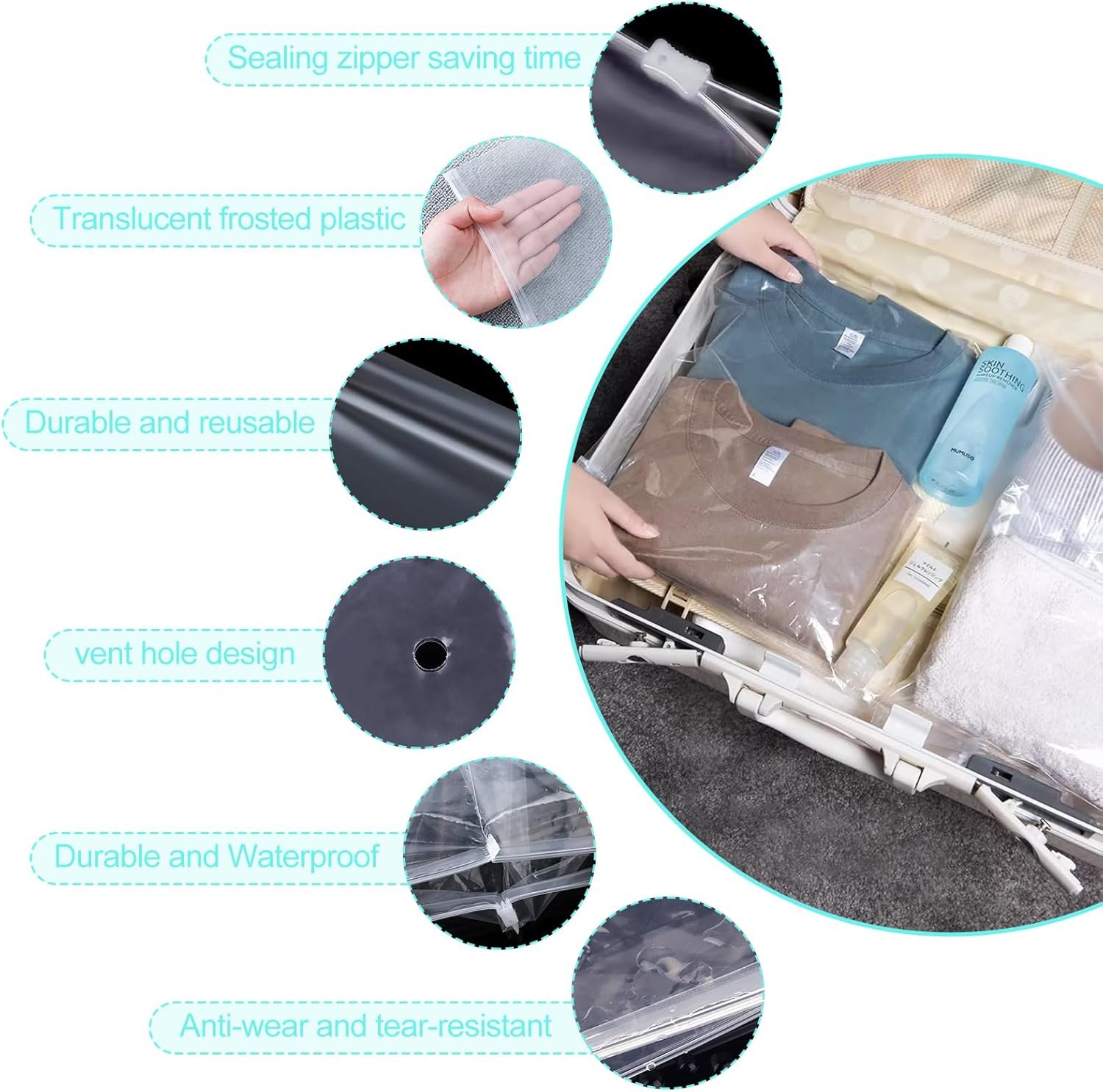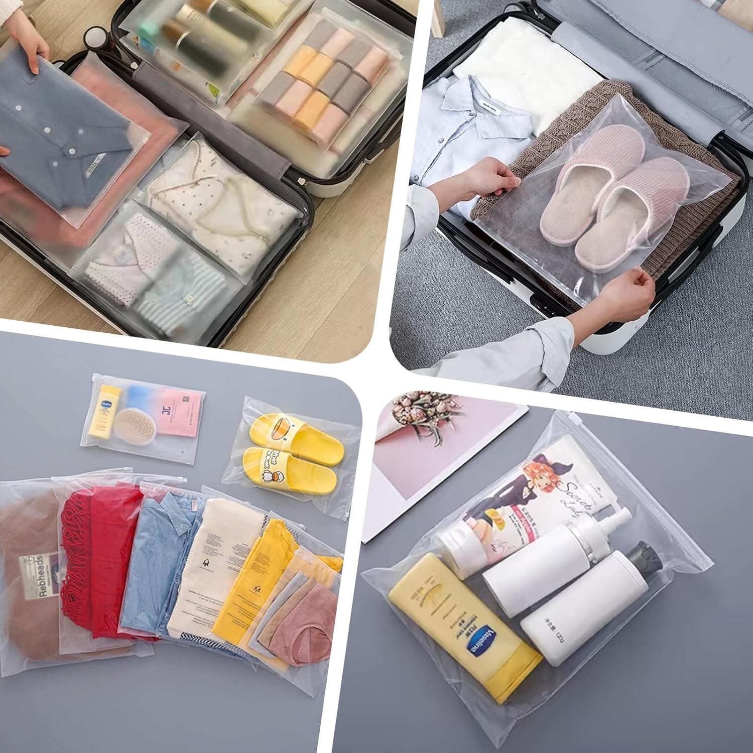 Cremallera: cada bolsa de almacenamiento está equipada con una cremallera reeditable que se puede abrir y cerrar fácilmente y herméticamente. Puedes deslizar fácilmente la bolsa hacia arriba y hacia abajo varias veces y luego usarla repetidamente. Es muy adecuado para almacenar artículos de viaje, como ropa, ropa interior, zapatos, cosméticos, toallas, artículos de aseo, juguetes, utensilios de cuidado, etc.