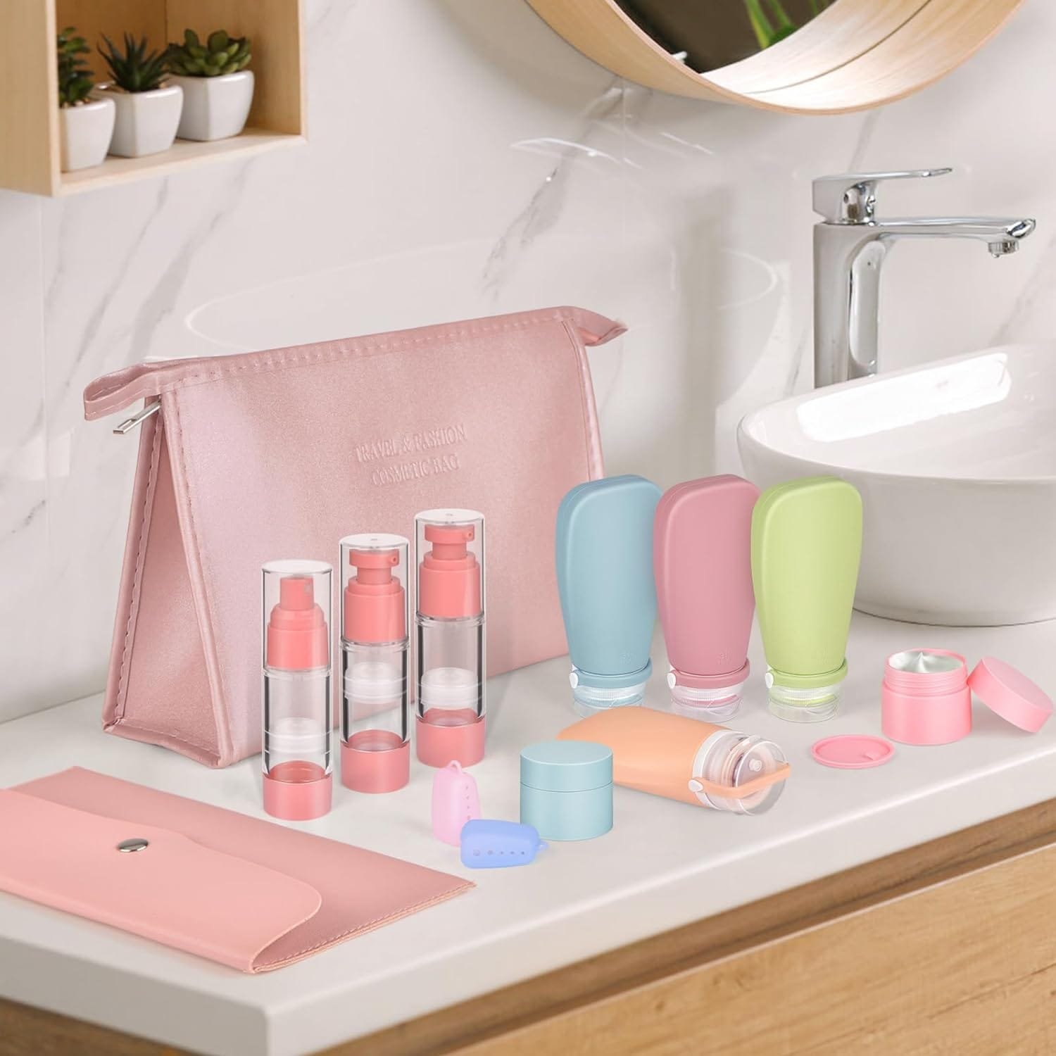 [TSA Aprobado Para Llevar a Bordo]: Nuestros envases de tamaño de viaje cumplen con las normas de la TSA, brindándole tranquilidad durante su viaje. Cada juego incluye una bolsa de maquillaje de viaje, asegurando que sus botellas de productos de aseo estén organizadas y sean fácilmente accesibles durante su viaje