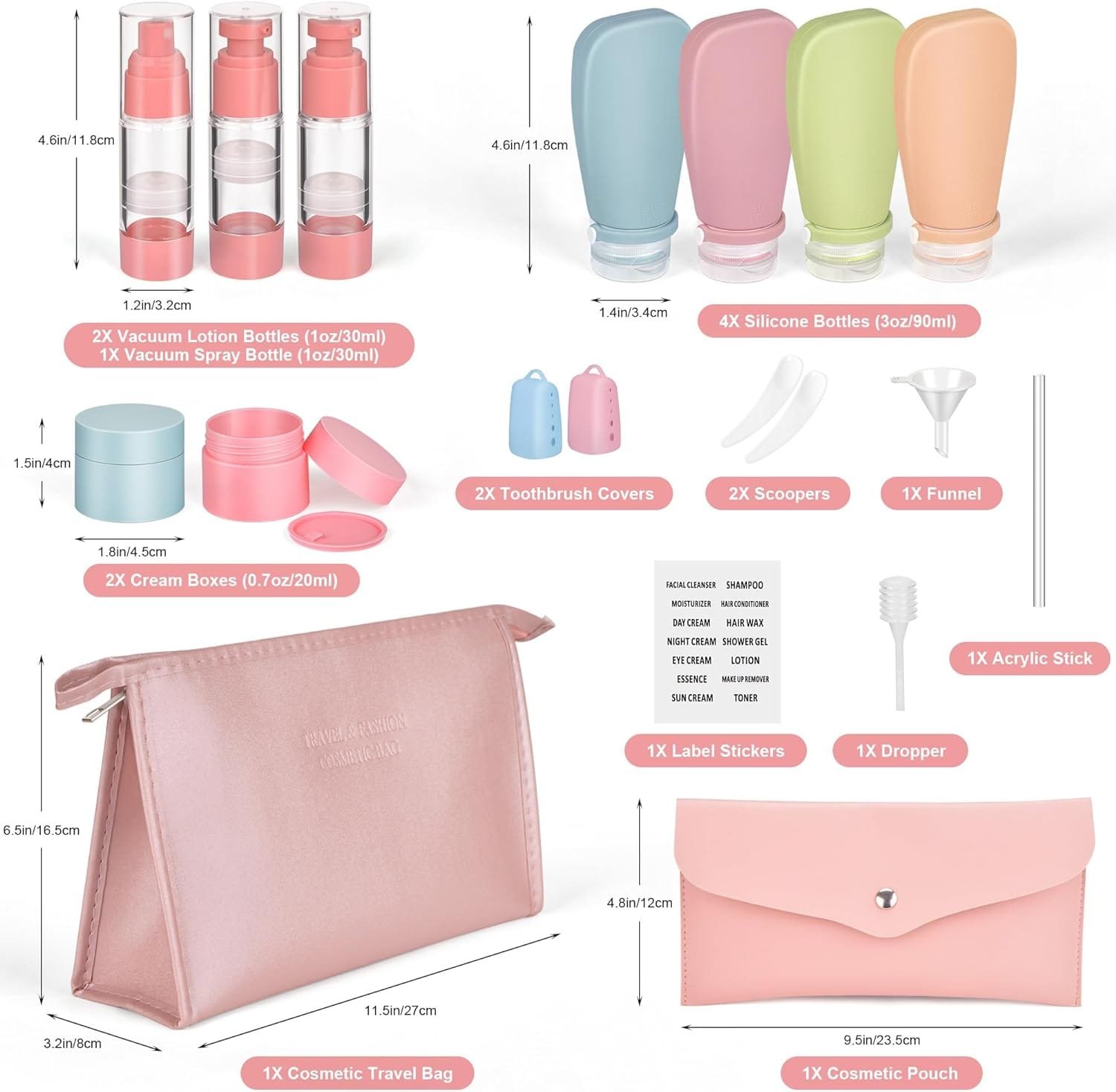 [Kit Esencial Para Viajes]: Mantenga su viaje organizado con nuestro conjunto de 18 botellas de viaje, que incluye 1 neceser para maquillaje, 4 botellas de silicona (90 ml), 2 botellas de vacío para lociones (30 ml), 1 botella de spray de vacío (30 ml), 2 estuches para crema (20 ml), 2 fundas para cepillos de dientes, 2 cucharas, 1 barra acrílica, 1 embudo, 1 gotero y 1 etiqueta, satisfaciendo todas sus necesidades de cuidado personal
