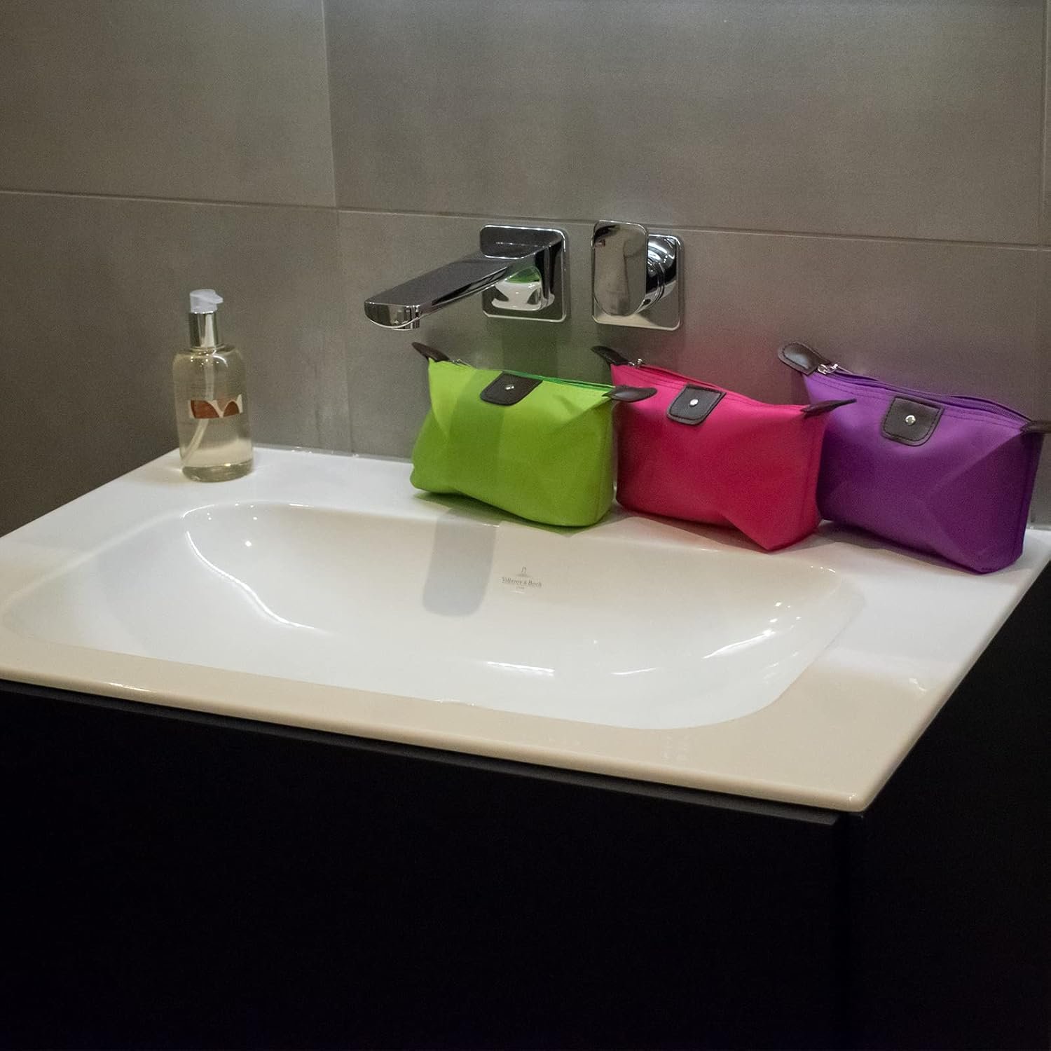 TRIXES Borse da toilette mostrate su un lavandino del bagnoTRIXES Borse da toilette mostrate su un lavandino del bagno